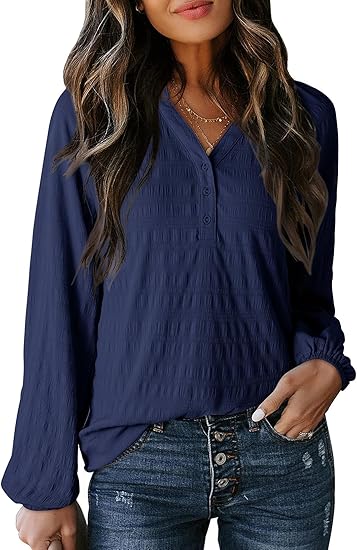 Womens Tops Dressy Casual Lantern Long Sleeve Shirts Fall Outfits Textured Business Blouses V Neck Button Down Shirts