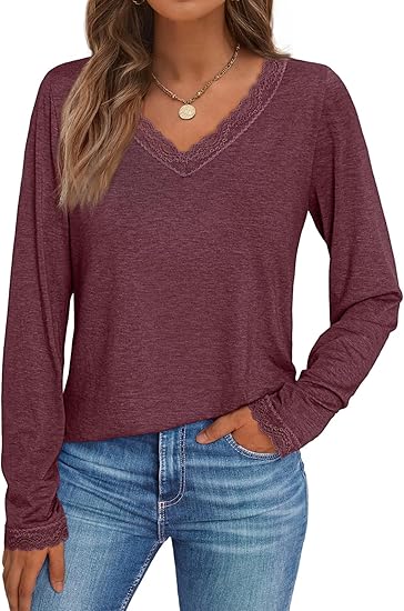 Long Sleeve T Shirts for Women Lace V Neck Casual Cute Tops Loose Fit Fall Winter Basic Clothing