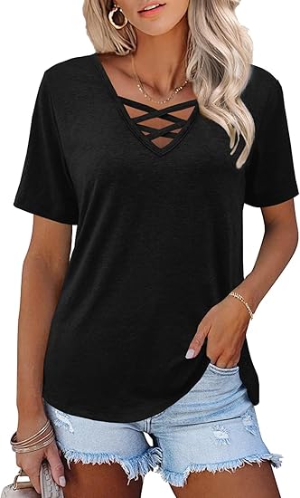 Womens Tops Short Sleeve V Neck Shirts Loose Casual Blouses Summer Tees Criss Cross